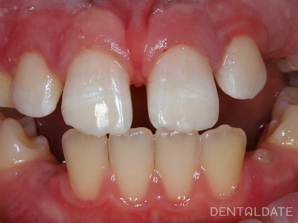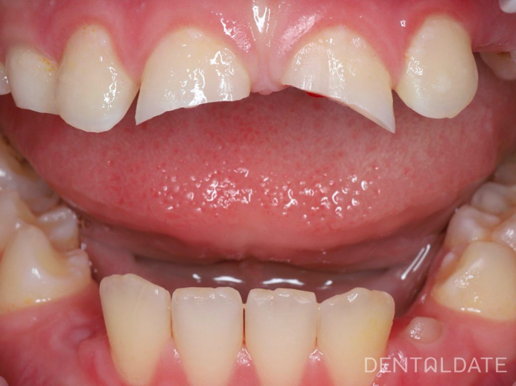 An adolescent presented to us with complaints of severe pain and damage to the upper central teeth after an injury. On examination, we found chipping of the coronal part and exposure of the pulp tissue. Such injuries are especially risky at a young age: without treatment, tooth loss, inflammatory complications, and the development of chronic pain are possible.