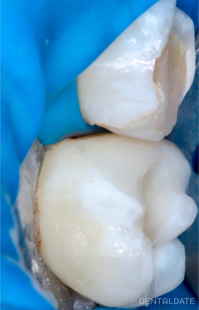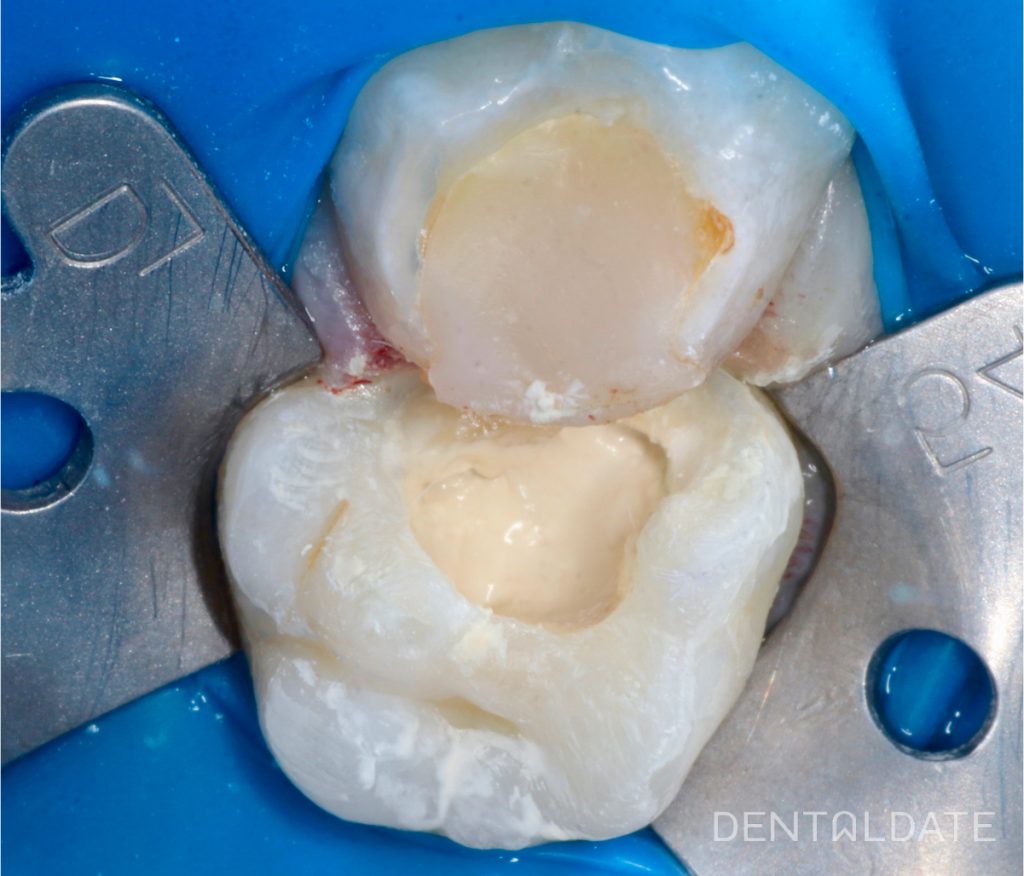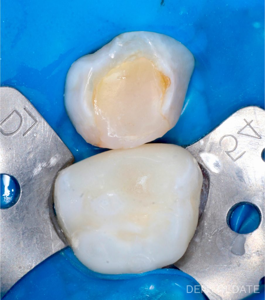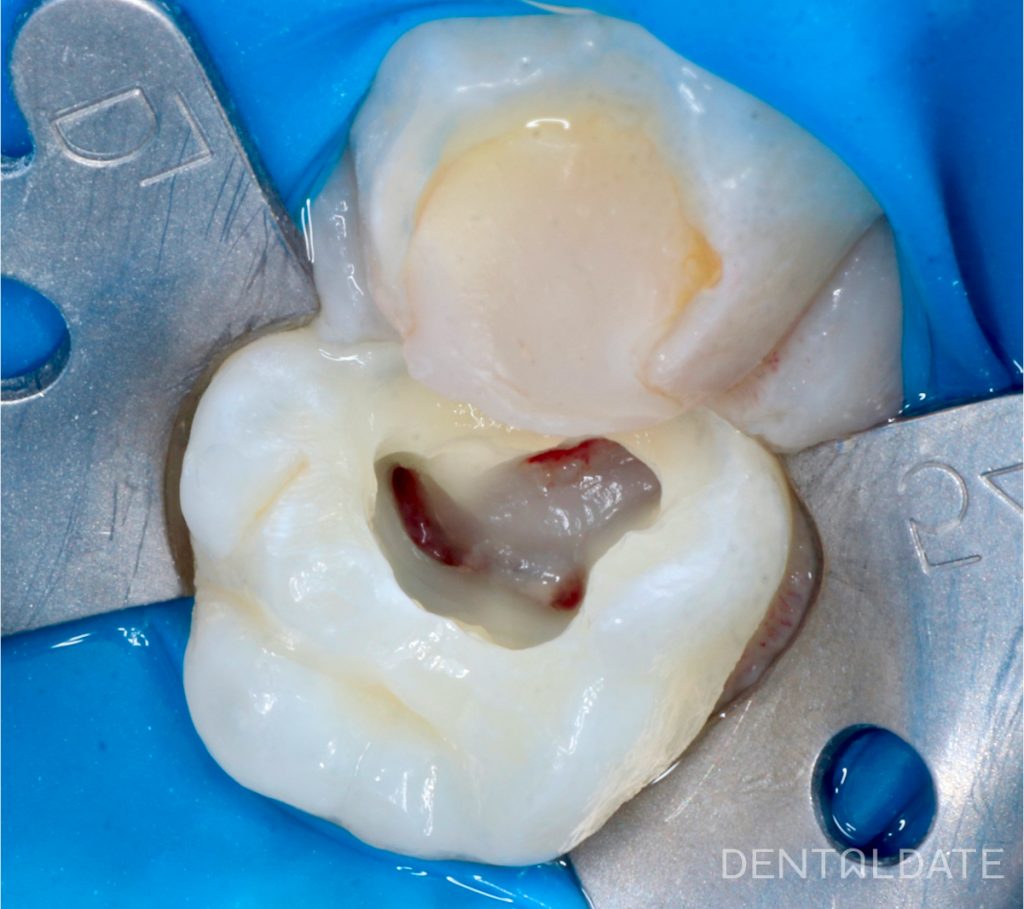 Clinical findings: Tooth 65 is retained in the arch, shows no mobility, and responds to cold stimulus. A deep carious lesion is present; probing is painful within the coronal pulp, with moderate bleeding. Radiographically, the roots are fully formed, no periapical pathology is observed, and there are no signs of resorption.