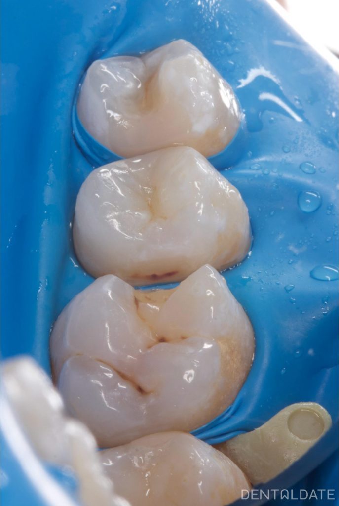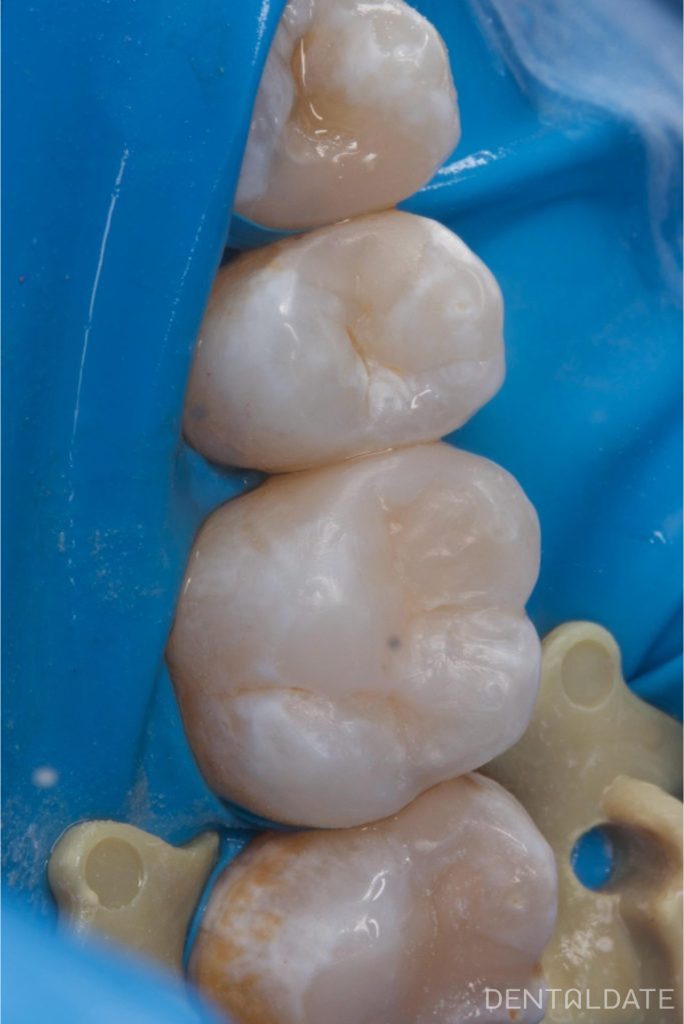 The teeth are fully anatomically restored, with tight contact maintained to avoid food ingestion.