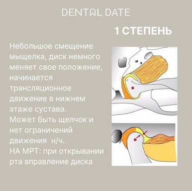 На данном этапе ограничений в движении нижней челюсти, как правило, ещё нет, и функция сохраняется в полном объёме. Однако щелчки при движении — уже сигнал о том, что нарушена синхронная работа диска и мыщелка.