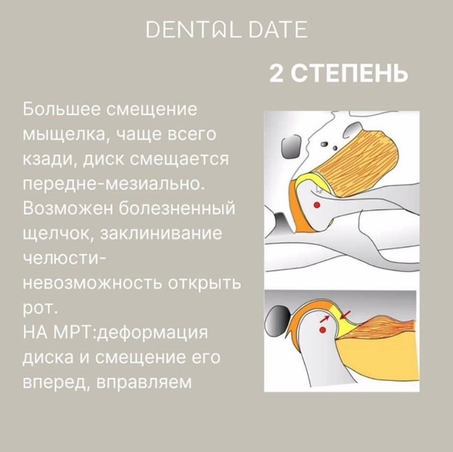 На второй стадии изменения в височно-нижнечелюстном суставе становятся более выраженными и начинают влиять на качество жизни пациента. Смещение мыщелка усиливается, чаще всего кзади и книзу, что влечёт за собой заметное смещение суставного диска вперёд и внутрь.