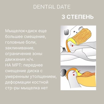 На третьей стадии происходят серьёзные изменения в структуре и функциях ВНЧС. Нарушение координации между суставным диском и мыщелком нижней челюсти становится стойким и очевидным. Смещение комплекса «диск + мыщелок» прогрессирует, и компенсационные механизмы организма больше не справляются с нагрузкой.