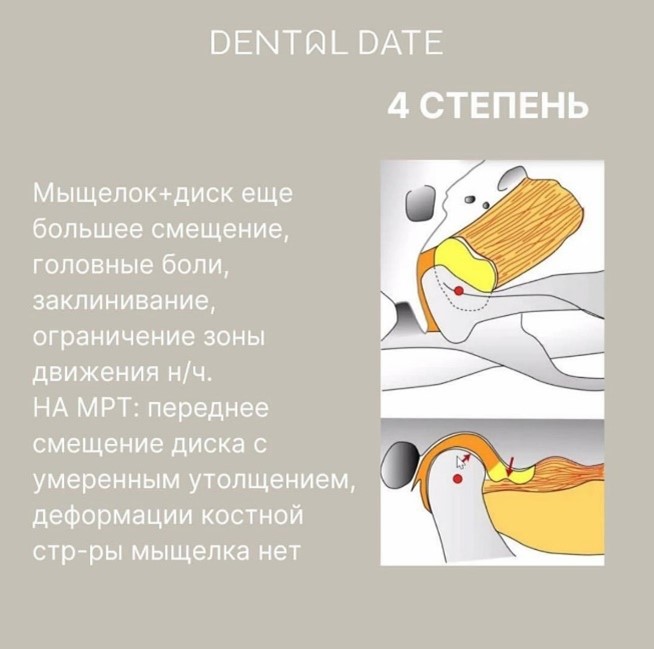 На четвёртой стадии дисфункции височно-нижнечелюстного сустава происходит значительное анатомическое и функциональное нарушение. Патологические процессы из функциональной фазы переходят в структурную: изменения в диске и мыщелке становятся выраженными и всё менее обратимыми.