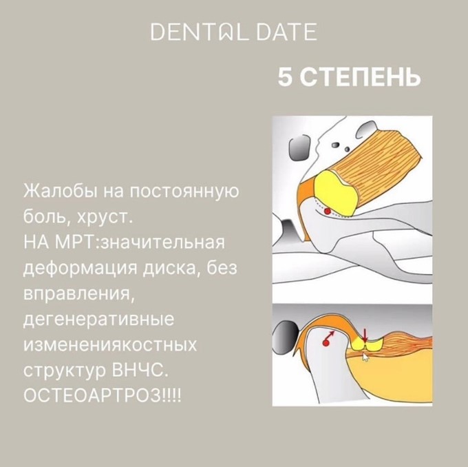 Пятая степень — это терминальная стадия дисфункции височно-нижнечелюстного сустава, при которой происходят тяжёлые дегенеративные изменения не только в мягкотканевых структурах (диске), но и в костной ткани. На этом этапе сустав уже не способен выполнять свою функцию полноценно, а качество жизни пациента резко снижается.